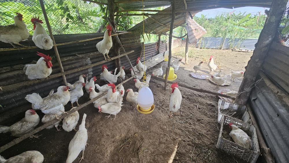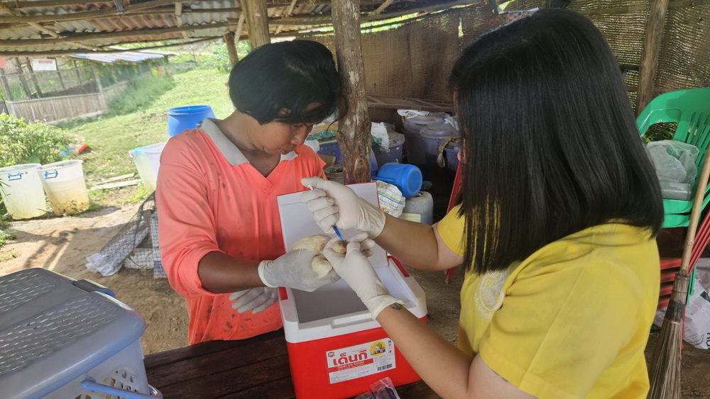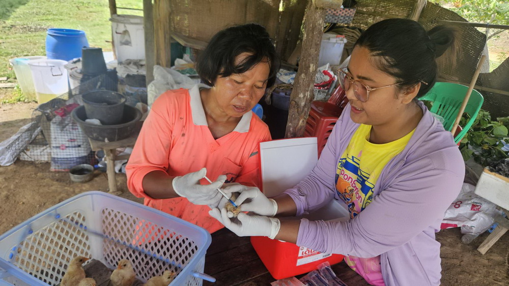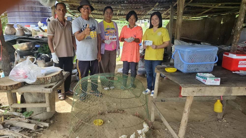 วันที่ 15 กันยายน 2568 เวลา 09.00 น. นายอดิเรก จันทะศิลา ปศุสัตว์อำเภอโป่งน้ำร้อน มอบหมายให้นางสาววลีรัตน์ อินทเวช เจ้าพนักงานสัตวบาล และนางสาวพันทิวา สีชมภู จ้างเหมาบริการช่วยงานด้านสัตวแพทย์ ลงพื้นที่ตรวจเยี่ยมกลุ่มเกษตรกร กลุ่มทับปะตีโมเดล ม.8 ต.โป่งน้ำร้อน (กลุ่ม สปก.) เพื่อติดตามการขยายผลของไก่ไข่พันธุ์เล็กฮอร์นที่มอบให้ ซึ่งปัจจุบันมีการฟักไข่ได้ลูกเจี๊ยบจำนวน 15 ตัว และได้แนะนำวิธีการทำวัคซีนป้องกันโรคนิวคาสเซิลหลอดลมอักเสบในสัตว์ปีก พร้อมมอบยาซองปฏิชีวนะ แนะนำวิธีการดูแลสัตว์ปีกช่วงอากาศเปลี่ยน