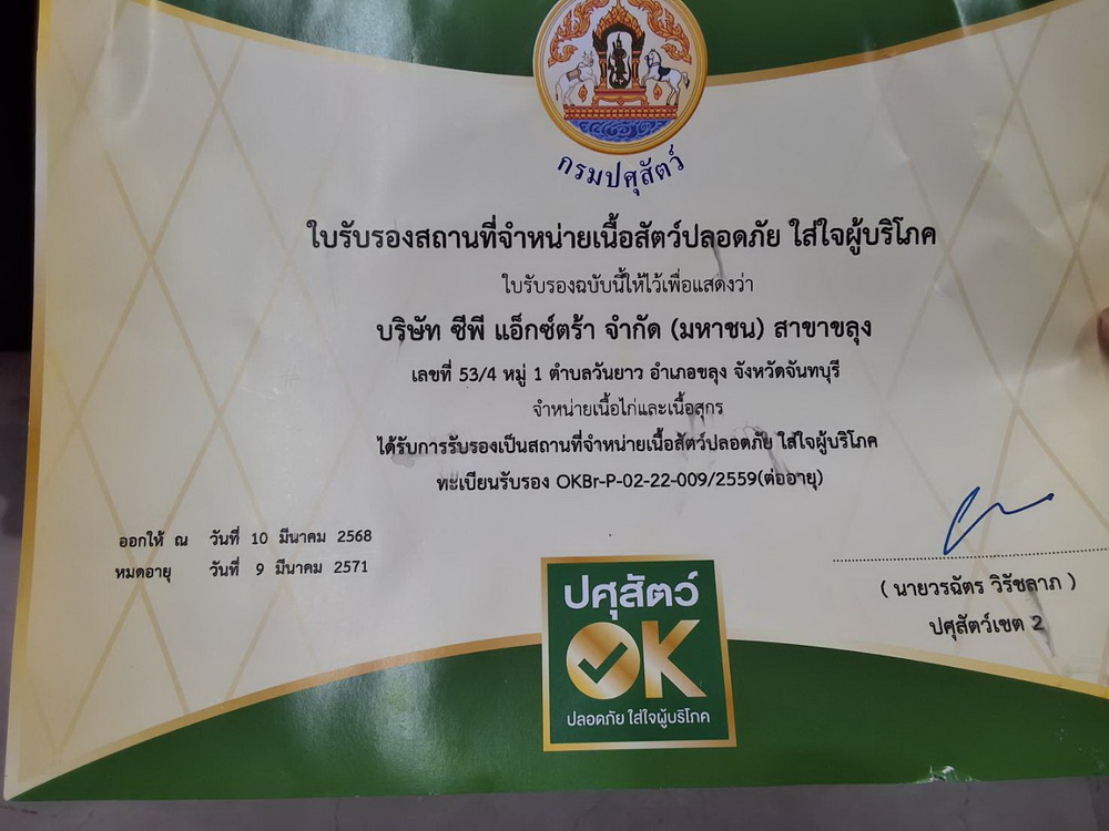 2.มอบใบรับรองสถานที่จำหน่ายเนื้อสัตว์ปลอดภัย ใส่ใจผู้บริโภค ให้กับ บริษัท ซีพี แอ็กซ์ตร้า จำกัด (มหาชน) สาขาขลุง